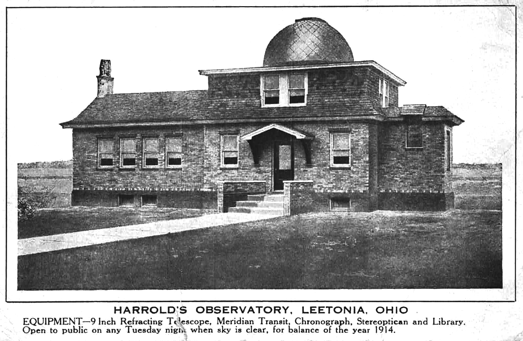 The imprint on the face of the picture post card reads, “Harrold’s Observatory, Leetonia, Ohio. Equipment — 9 Inch Refracting Telescope, Meridian Transit, Chronograph, Stereoptican and Library. Open to public on any Tuesday night when sky is clear, for balance of the year 1914.” We take 1914 as the date of the image and printed card.
