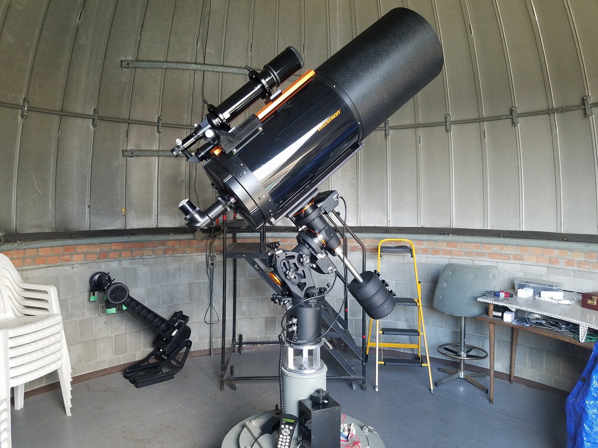 Other upgrades were made to improve the usability of the telescope. The mount was updated to include encoders to improve locating objects with the telescope using a computer with a planetarium program. Accessories were bought to improve the viewing enjoyment through the telescope, including a bino-viewer and new eyepieces. In 2017 a new mount was put under the telescope with a GoTo system to provide even easier locating of objects in our night sky, which has considerable light pollution.